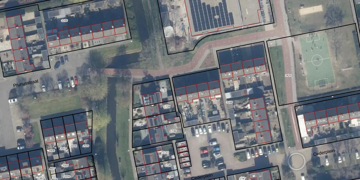 Het perceel waarop Cederplein 19 staat heeft een oppervlakte van 2247 m². Dit is een zeer groot perceel. De perceeloppervlakte wordt geregistreerd door het Kadaster. Gedetailleerde informatie over de maten van dit perceel kunt u vinden in het rapport Kadastrale kaart met maatvoering van Cederplein 19.