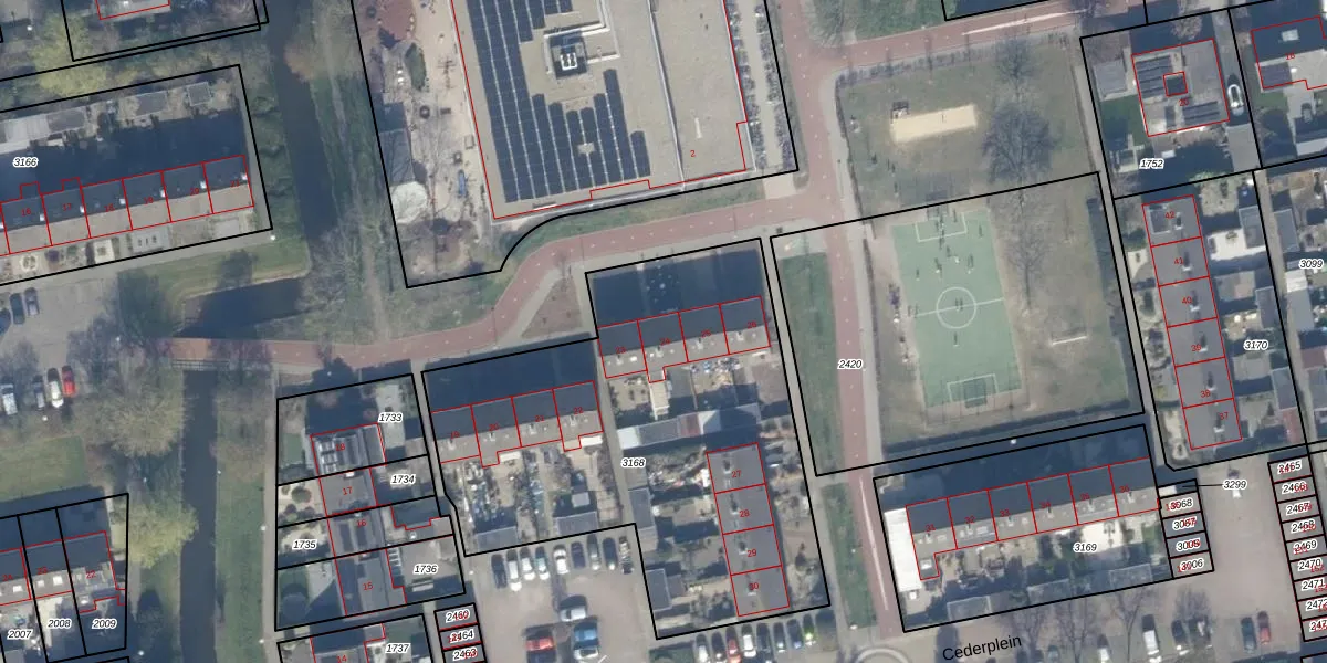 Het perceel waarop Cederplein 24 staat heeft een oppervlakte van 2247 m². Dit is een zeer groot perceel. De perceeloppervlakte wordt geregistreerd door het Kadaster. Gedetailleerde informatie over de maten van dit perceel kunt u vinden in het rapport Kadastrale kaart met maatvoering van Cederplein 24.