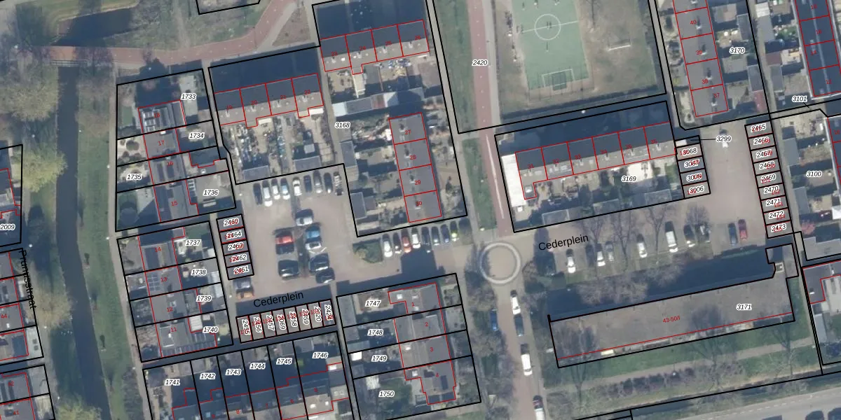 Het perceel waarop Cederplein 30 staat heeft een oppervlakte van 2247 m². Dit is een zeer groot perceel. De perceeloppervlakte wordt geregistreerd door het Kadaster. Gedetailleerde informatie over de maten van dit perceel kunt u vinden in het rapport Kadastrale kaart met maatvoering van Cederplein 30.
