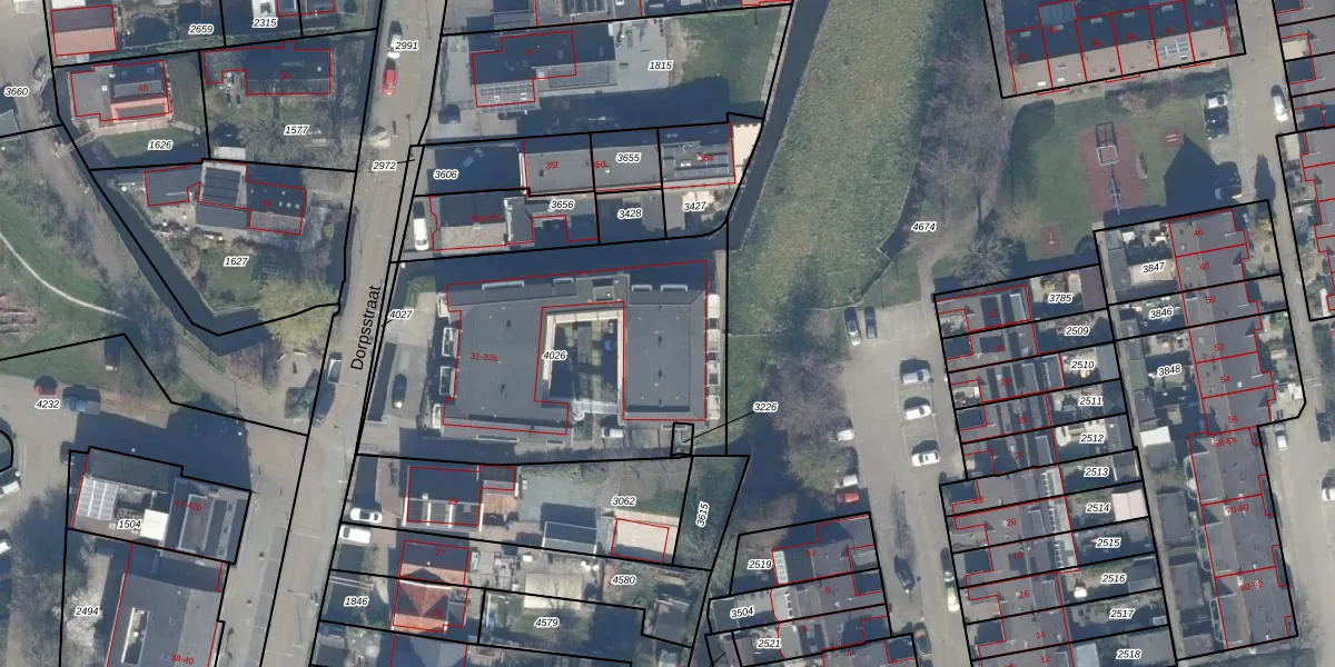 Dorpsstraat 33-f is gelegen op kadastraal perceel LMD02A4026. Deze kadastrale aanduiding is uniek en wordt gebruikt door het Kadaster om eigendomsrechten en andere zakelijke rechten vast te leggen. Het perceel maakt onderdeel uit van de kadastrale gemeente Leimuiden.