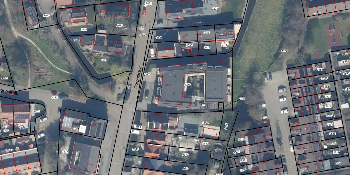 Het perceel waarop Dorpsstraat 33-l staat heeft een oppervlakte van 1651 m². Dit is een zeer groot perceel. De perceeloppervlakte wordt geregistreerd door het Kadaster. Gedetailleerde informatie over de maten van dit perceel kunt u vinden in het rapport Kadastrale kaart met maatvoering van Dorpsstraat 33-l.