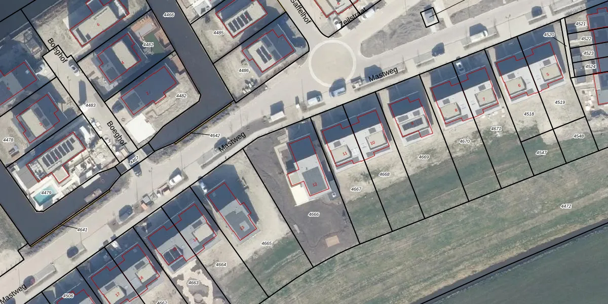 Het perceel waarop Mastweg 12 staat heeft een oppervlakte van 945 m². Dit is een groot perceel. De perceeloppervlakte wordt geregistreerd door het Kadaster. Gedetailleerde informatie over de maten van dit perceel kunt u vinden in het rapport Kadastrale kaart met maatvoering van Mastweg 12.