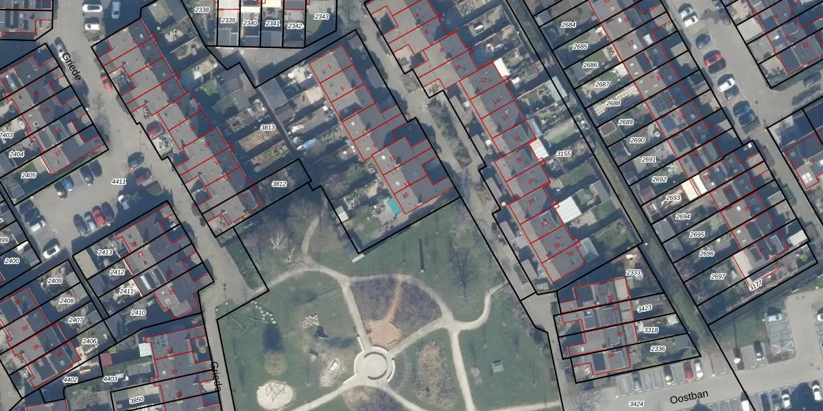 Het perceel waarop Oostban 15 staat heeft een oppervlakte van 2640 m². Dit is een zeer groot perceel. De perceeloppervlakte wordt geregistreerd door het Kadaster. Gedetailleerde informatie over de maten van dit perceel kunt u vinden in het rapport Kadastrale kaart met maatvoering van Oostban 15.