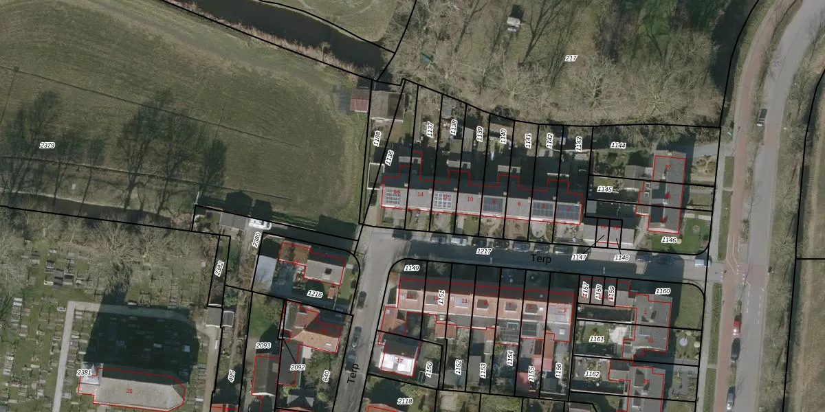 Het perceel waarop Terp 14 staat heeft een oppervlakte van 201 m². Dit is een middelgroot perceel. De perceeloppervlakte wordt geregistreerd door het Kadaster. Gedetailleerde informatie over de maten van dit perceel kunt u vinden in het rapport Kadastrale kaart met maatvoering van Terp 14.