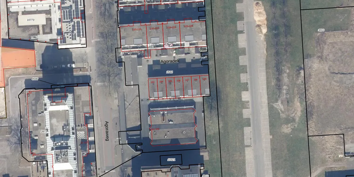 Het perceel waarop Agoradek 106 staat heeft een oppervlakte van 4624 m². Dit is een zeer groot perceel. De perceeloppervlakte wordt geregistreerd door het Kadaster. Gedetailleerde informatie over de maten van dit perceel kunt u vinden in het rapport Kadastrale kaart met maatvoering van Agoradek 106.