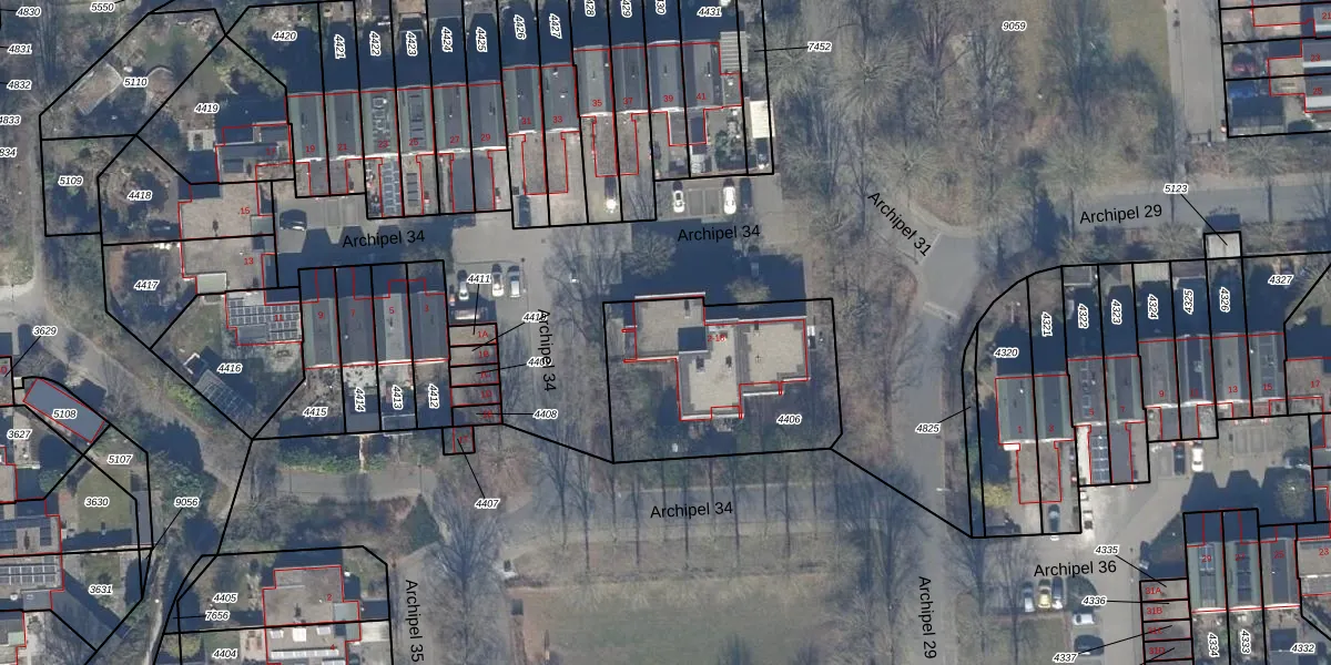 Het perceel waarop Archipel 34 14 staat heeft een oppervlakte van 801 m². Dit is een groot perceel. De perceeloppervlakte wordt geregistreerd door het Kadaster. Gedetailleerde informatie over de maten van dit perceel kunt u vinden in het rapport Kadastrale kaart met maatvoering van Archipel 34 14.