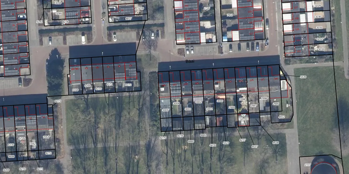 Het perceel waarop Baai 107 staat heeft een oppervlakte van 169 m². Dit is een middelgroot perceel. De perceeloppervlakte wordt geregistreerd door het Kadaster. Gedetailleerde informatie over de maten van dit perceel kunt u vinden in het rapport Kadastrale kaart met maatvoering van Baai 107.