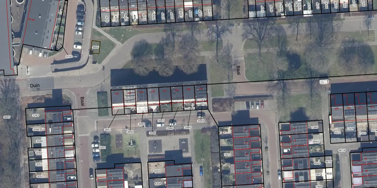 Het perceel waarop Baai 155 staat heeft een oppervlakte van 83 m². Dit is een klein perceel. De perceeloppervlakte wordt geregistreerd door het Kadaster. Gedetailleerde informatie over de maten van dit perceel kunt u vinden in het rapport Kadastrale kaart met maatvoering van Baai 155.