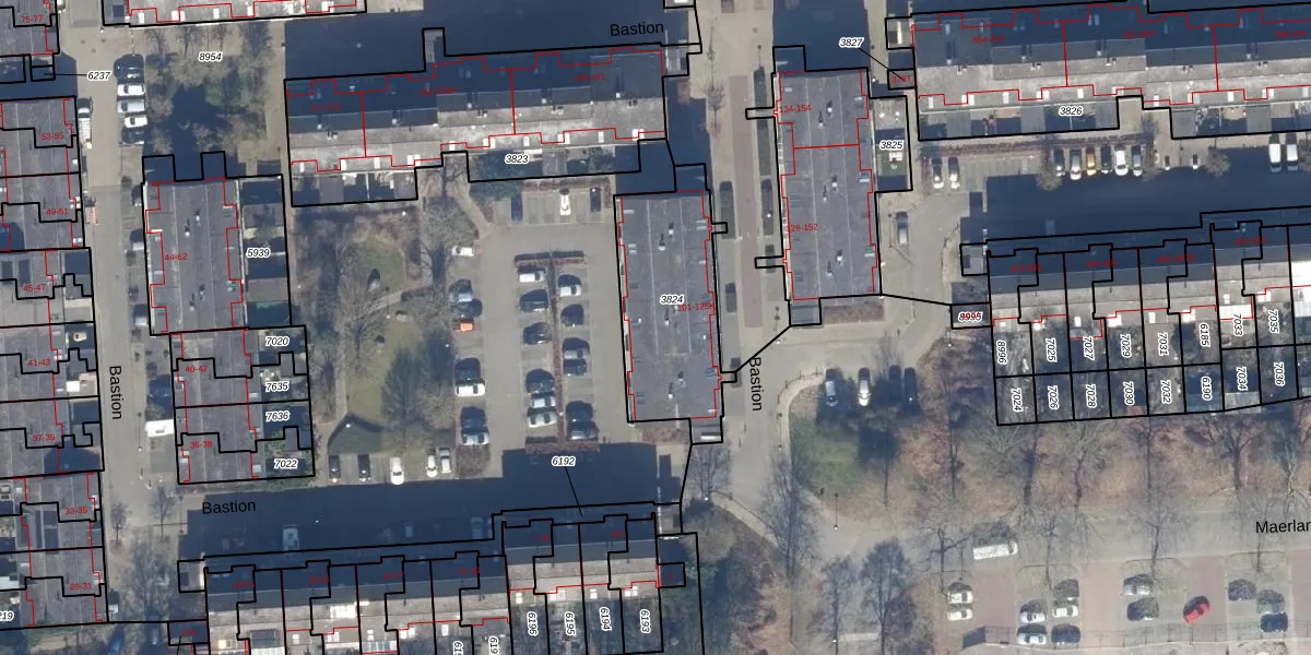 Het perceel waarop Bastion 117 staat heeft een oppervlakte van 552 m². Dit is een groot perceel. De perceeloppervlakte wordt geregistreerd door het Kadaster. Gedetailleerde informatie over de maten van dit perceel kunt u vinden in het rapport Kadastrale kaart met maatvoering van Bastion 117.