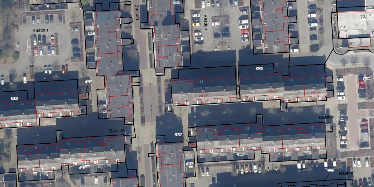 Het perceel waarop Bastion 377 staat heeft een oppervlakte van 1577 m². Dit is een zeer groot perceel. De perceeloppervlakte wordt geregistreerd door het Kadaster. Gedetailleerde informatie over de maten van dit perceel kunt u vinden in het rapport Kadastrale kaart met maatvoering van Bastion 377.