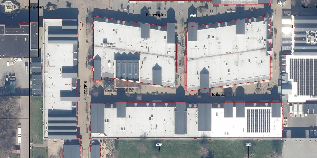 Het perceel waarop Bataviaplein 21 staat heeft een oppervlakte van 2,7 ha. Dit is een zeer groot perceel. De perceeloppervlakte wordt geregistreerd door het Kadaster. Gedetailleerde informatie over de maten van dit perceel kunt u vinden in het rapport Kadastrale kaart met maatvoering van Bataviaplein 21.