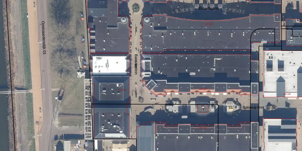 Het perceel waarop Bataviaplein 218 staat heeft een oppervlakte van 1,2 ha. Dit is een zeer groot perceel. De perceeloppervlakte wordt geregistreerd door het Kadaster. Gedetailleerde informatie over de maten van dit perceel kunt u vinden in het rapport Kadastrale kaart met maatvoering van Bataviaplein 218.