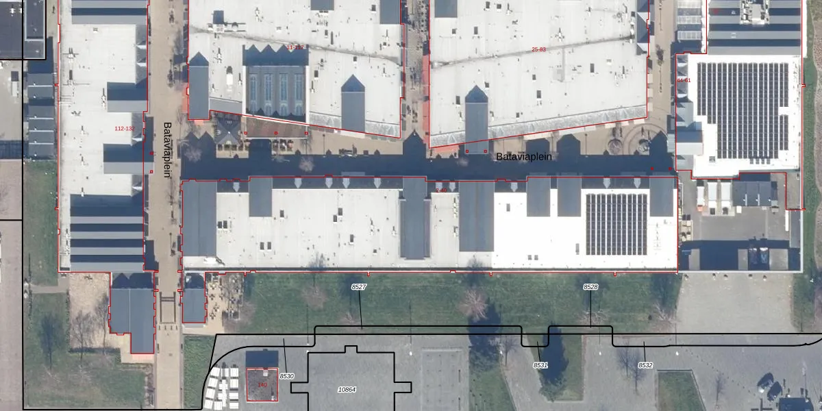 Het perceel waarop Bataviaplein 24 staat heeft een oppervlakte van 2,7 ha. Dit is een zeer groot perceel. De perceeloppervlakte wordt geregistreerd door het Kadaster. Gedetailleerde informatie over de maten van dit perceel kunt u vinden in het rapport Kadastrale kaart met maatvoering van Bataviaplein 24.