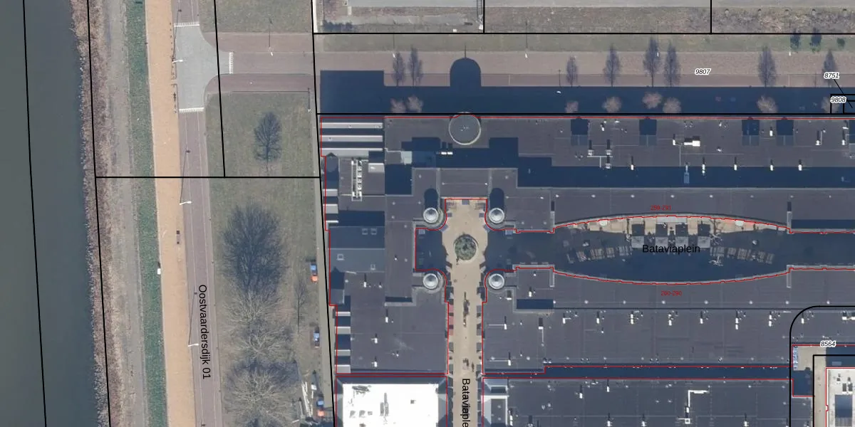 Het perceel waarop Bataviaplein 267 staat heeft een oppervlakte van 1,2 ha. Dit is een zeer groot perceel. De perceeloppervlakte wordt geregistreerd door het Kadaster. Gedetailleerde informatie over de maten van dit perceel kunt u vinden in het rapport Kadastrale kaart met maatvoering van Bataviaplein 267.