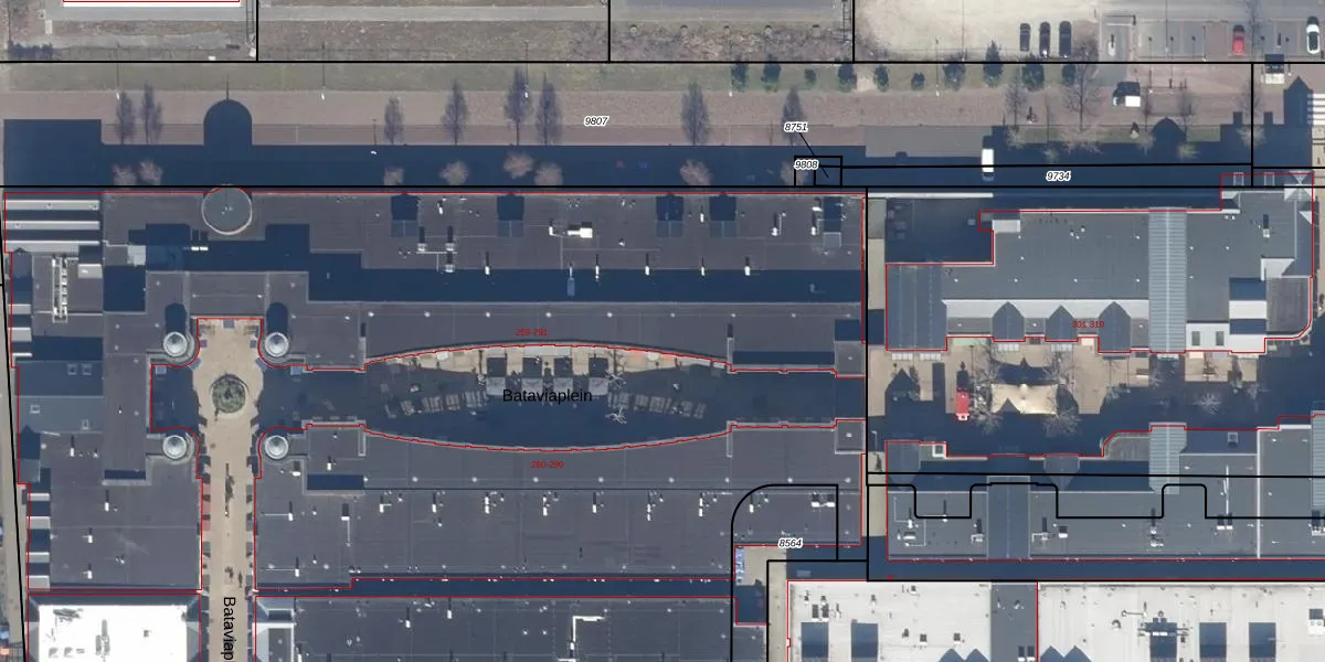 Het perceel waarop Bataviaplein 285 staat heeft een oppervlakte van 1,2 ha. Dit is een zeer groot perceel. De perceeloppervlakte wordt geregistreerd door het Kadaster. Gedetailleerde informatie over de maten van dit perceel kunt u vinden in het rapport Kadastrale kaart met maatvoering van Bataviaplein 285.