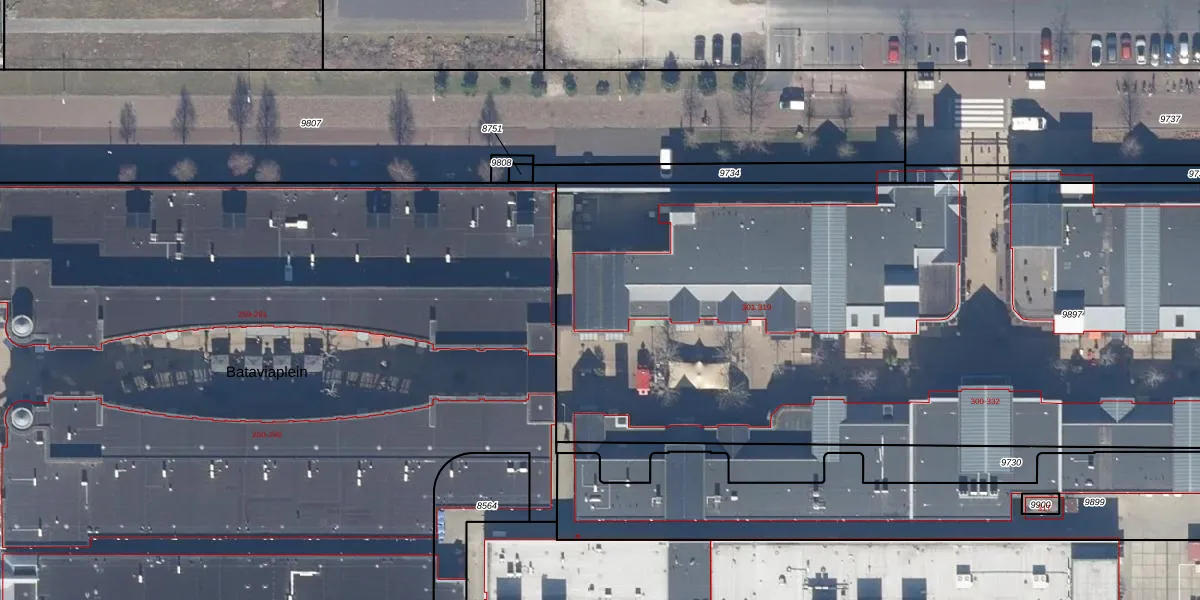 Het perceel waarop Bataviaplein 301 staat heeft een oppervlakte van 7460 m². Dit is een zeer groot perceel. De perceeloppervlakte wordt geregistreerd door het Kadaster. Gedetailleerde informatie over de maten van dit perceel kunt u vinden in het rapport Kadastrale kaart met maatvoering van Bataviaplein 301.