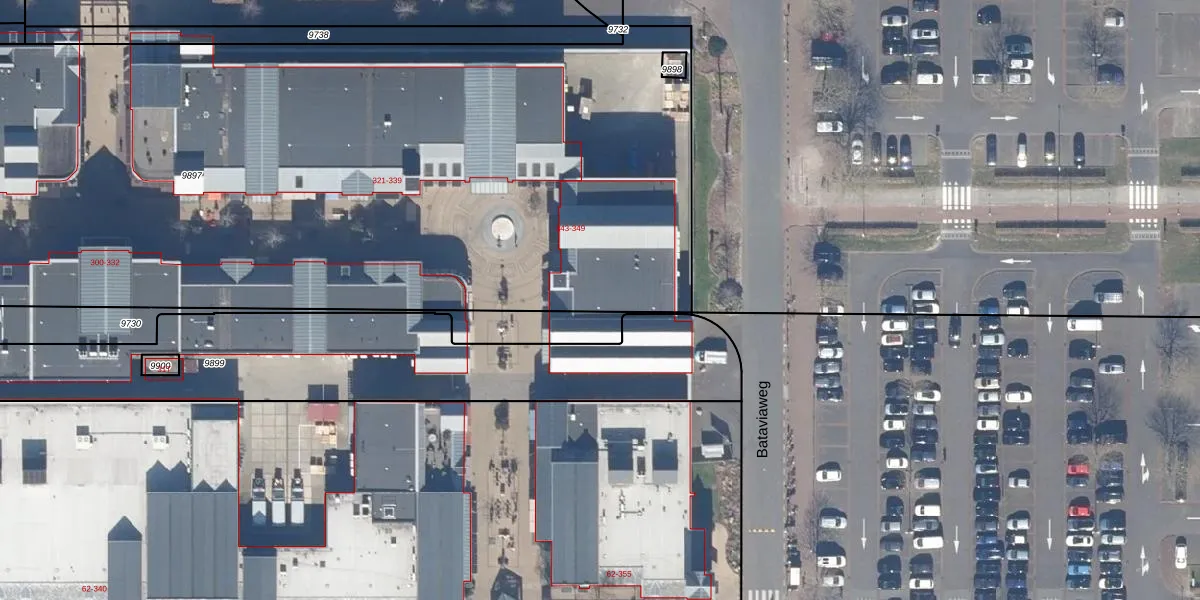 Het perceel waarop Bataviaplein 347 staat heeft een oppervlakte van 7460 m². Dit is een zeer groot perceel. De perceeloppervlakte wordt geregistreerd door het Kadaster. Gedetailleerde informatie over de maten van dit perceel kunt u vinden in het rapport Kadastrale kaart met maatvoering van Bataviaplein 347.