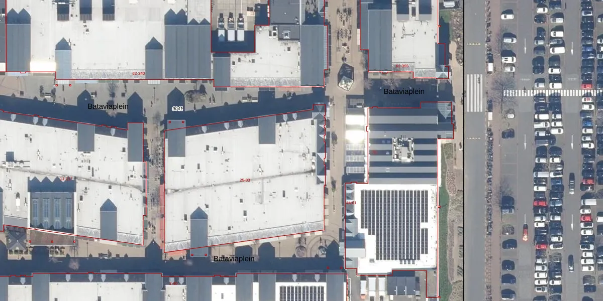 Het perceel waarop Bataviaplein 53 staat heeft een oppervlakte van 2,7 ha. Dit is een zeer groot perceel. De perceeloppervlakte wordt geregistreerd door het Kadaster. Gedetailleerde informatie over de maten van dit perceel kunt u vinden in het rapport Kadastrale kaart met maatvoering van Bataviaplein 53.