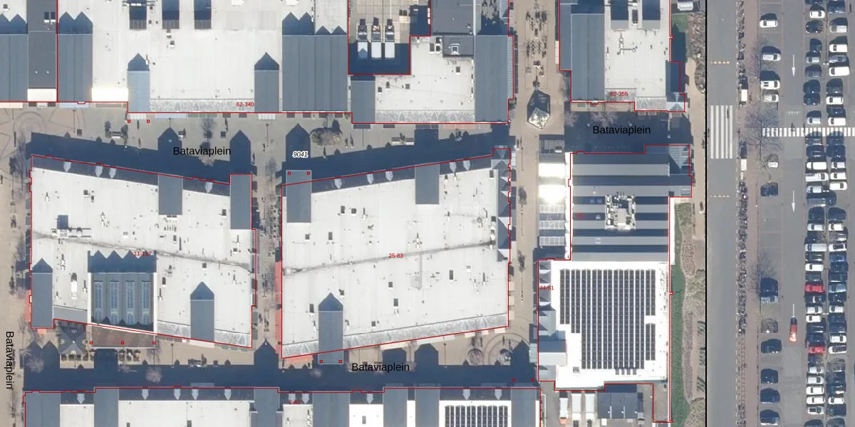 Het perceel waarop Bataviaplein 69 staat heeft een oppervlakte van 2,7 ha. Dit is een zeer groot perceel. De perceeloppervlakte wordt geregistreerd door het Kadaster. Gedetailleerde informatie over de maten van dit perceel kunt u vinden in het rapport Kadastrale kaart met maatvoering van Bataviaplein 69.