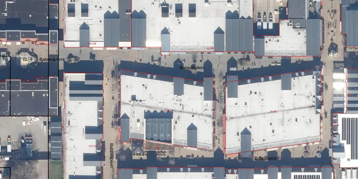 Het perceel waarop Bataviaplein 95 staat heeft een oppervlakte van 2,7 ha. Dit is een zeer groot perceel. De perceeloppervlakte wordt geregistreerd door het Kadaster. Gedetailleerde informatie over de maten van dit perceel kunt u vinden in het rapport Kadastrale kaart met maatvoering van Bataviaplein 95.