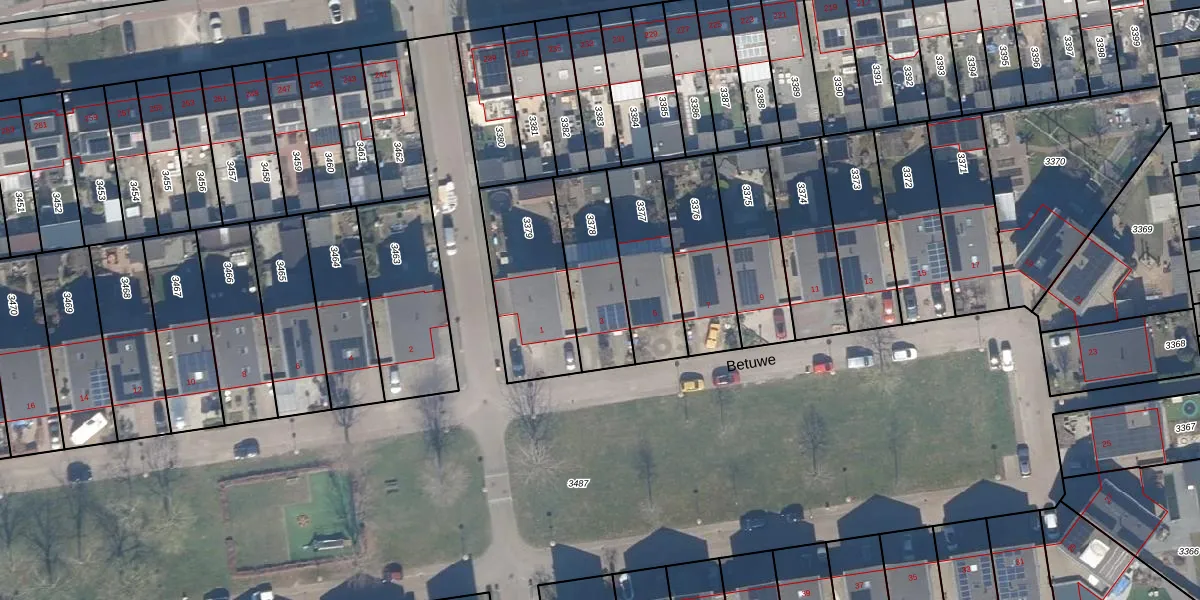 Het perceel waarop Betuwe 3 staat heeft een oppervlakte van 297 m². Dit is een middelgroot perceel. De perceeloppervlakte wordt geregistreerd door het Kadaster. Gedetailleerde informatie over de maten van dit perceel kunt u vinden in het rapport Kadastrale kaart met maatvoering van Betuwe 3.