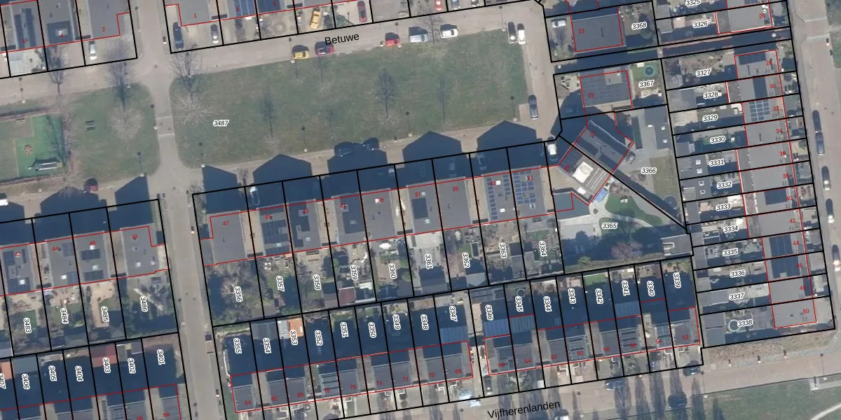 Het perceel waarop Betuwe 37 staat heeft een oppervlakte van 288 m². Dit is een middelgroot perceel. De perceeloppervlakte wordt geregistreerd door het Kadaster. Gedetailleerde informatie over de maten van dit perceel kunt u vinden in het rapport Kadastrale kaart met maatvoering van Betuwe 37.