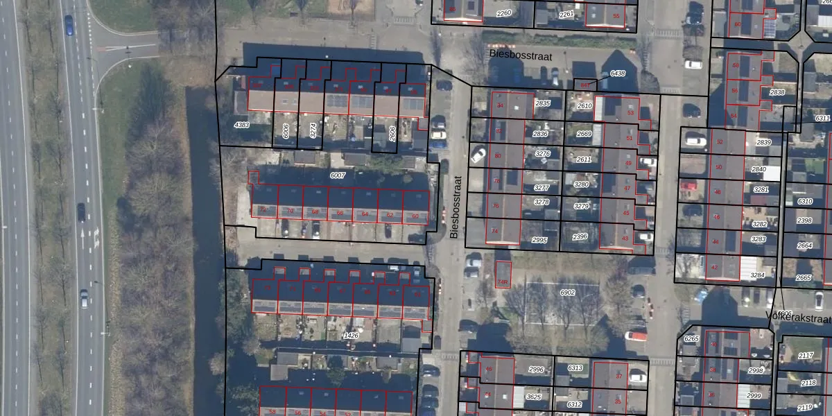 Het perceel waarop Biesbosstraat 60 staat heeft een oppervlakte van 1505 m². Dit is een zeer groot perceel. De perceeloppervlakte wordt geregistreerd door het Kadaster. Gedetailleerde informatie over de maten van dit perceel kunt u vinden in het rapport Kadastrale kaart met maatvoering van Biesbosstraat 60.