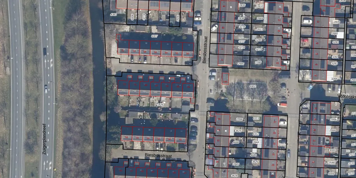 Het perceel waarop Biesbosstraat 63 staat heeft een oppervlakte van 2025 m². Dit is een zeer groot perceel. De perceeloppervlakte wordt geregistreerd door het Kadaster. Gedetailleerde informatie over de maten van dit perceel kunt u vinden in het rapport Kadastrale kaart met maatvoering van Biesbosstraat 63.