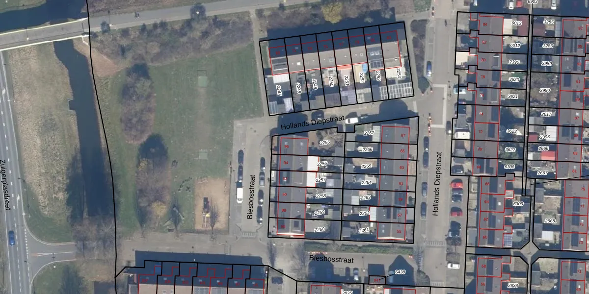 Biesbosstraat 96 is gelegen op kadastraal perceel LLS00O2255. Deze kadastrale aanduiding is uniek en wordt gebruikt door het Kadaster om eigendomsrechten en andere zakelijke rechten vast te leggen. Het perceel maakt onderdeel uit van de kadastrale gemeente Lelystad.