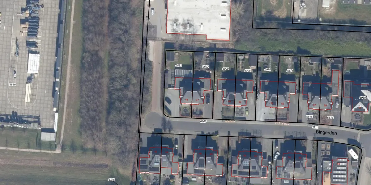 Het perceel waarop Bingerden 45 staat heeft een oppervlakte van 545 m². Dit is een groot perceel. De perceeloppervlakte wordt geregistreerd door het Kadaster. Gedetailleerde informatie over de maten van dit perceel kunt u vinden in het rapport Kadastrale kaart met maatvoering van Bingerden 45.