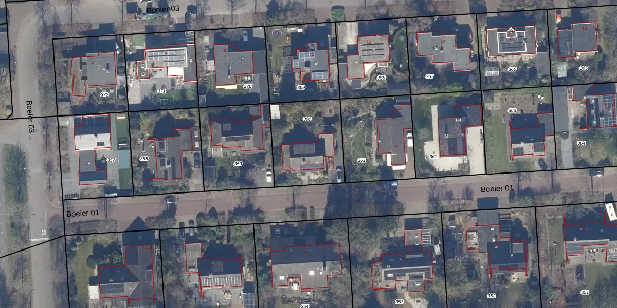 Het perceel waarop Boeier 01 7 staat heeft een oppervlakte van 625 m². Dit is een groot perceel. De perceeloppervlakte wordt geregistreerd door het Kadaster. Gedetailleerde informatie over de maten van dit perceel kunt u vinden in het rapport Kadastrale kaart met maatvoering van Boeier 01 7.