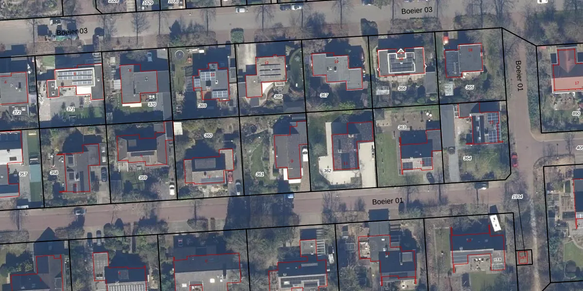 Het perceel waarop Boeier 01 9 staat heeft een oppervlakte van 624 m². Dit is een groot perceel. De perceeloppervlakte wordt geregistreerd door het Kadaster. Gedetailleerde informatie over de maten van dit perceel kunt u vinden in het rapport Kadastrale kaart met maatvoering van Boeier 01 9.