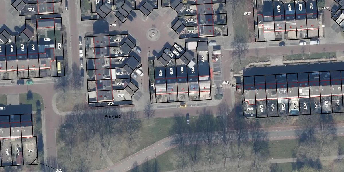 Het perceel waarop Bongerd 36 staat heeft een oppervlakte van 166 m². Dit is een middelgroot perceel. De perceeloppervlakte wordt geregistreerd door het Kadaster. Gedetailleerde informatie over de maten van dit perceel kunt u vinden in het rapport Kadastrale kaart met maatvoering van Bongerd 36.