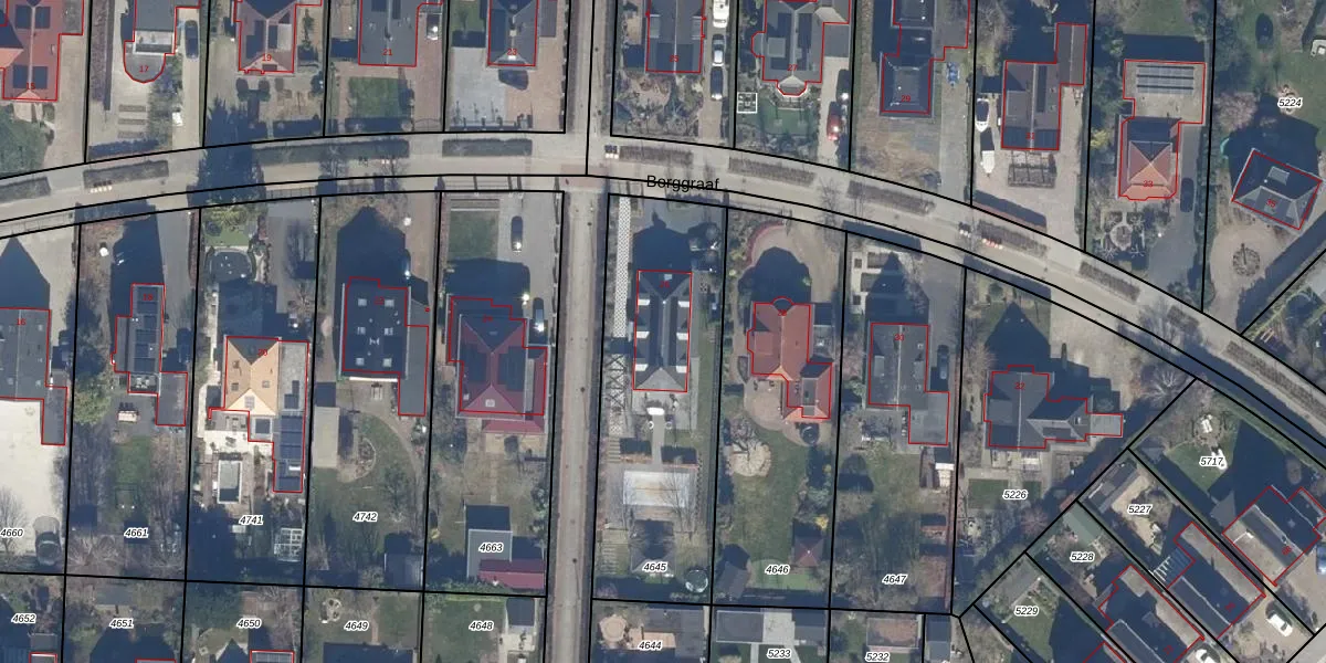 Het perceel waarop Borggraaf 26 staat heeft een oppervlakte van 1093 m². Dit is een zeer groot perceel. De perceeloppervlakte wordt geregistreerd door het Kadaster. Gedetailleerde informatie over de maten van dit perceel kunt u vinden in het rapport Kadastrale kaart met maatvoering van Borggraaf 26.