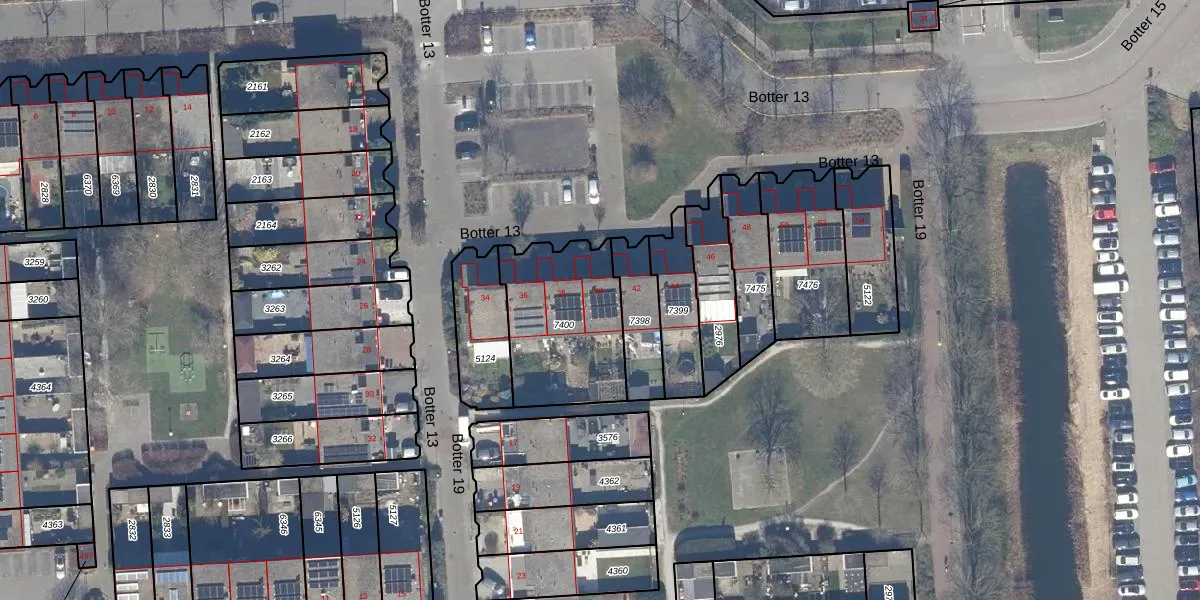 Het perceel waarop Botter 13 40 staat heeft een oppervlakte van 503 m². Dit is een groot perceel. De perceeloppervlakte wordt geregistreerd door het Kadaster. Gedetailleerde informatie over de maten van dit perceel kunt u vinden in het rapport Kadastrale kaart met maatvoering van Botter 13 40.