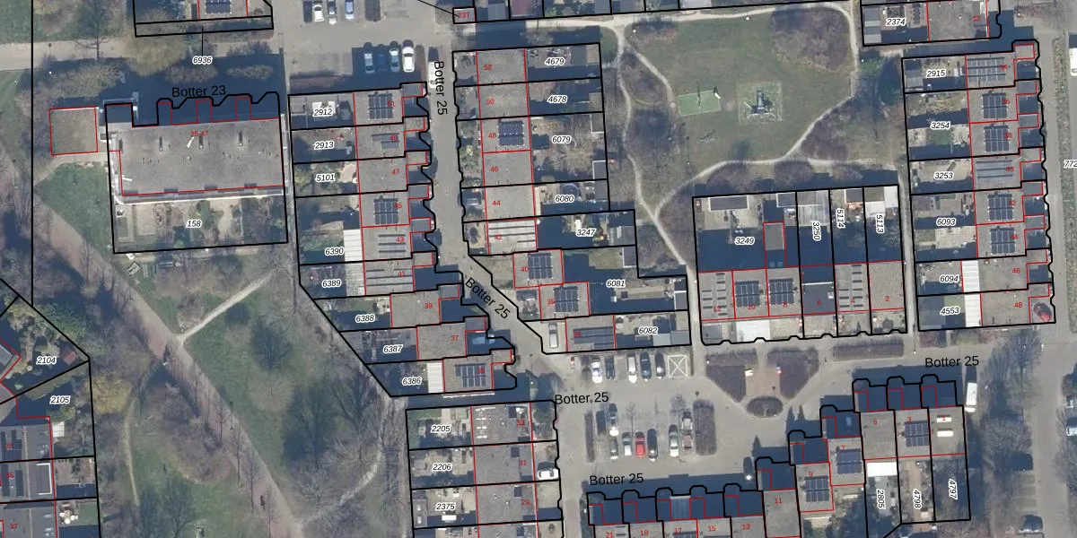 Het perceel waarop Botter 25 40 staat heeft een oppervlakte van 389 m². Dit is een groot perceel. De perceeloppervlakte wordt geregistreerd door het Kadaster. Gedetailleerde informatie over de maten van dit perceel kunt u vinden in het rapport Kadastrale kaart met maatvoering van Botter 25 40.