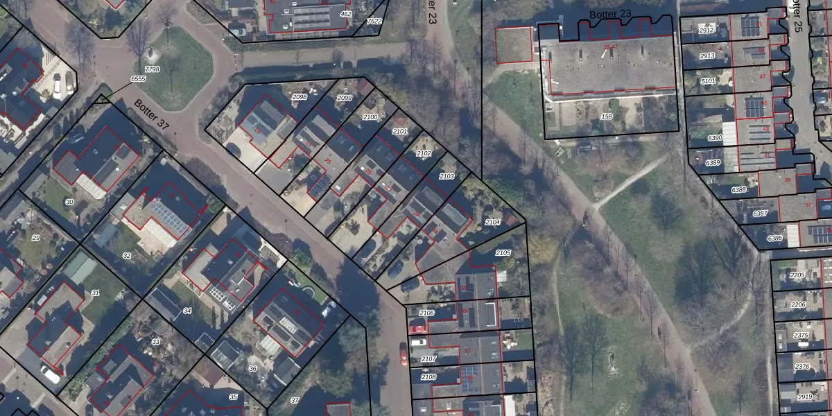 Botter 37 29 is gelegen op kadastraal perceel LLS00O2103. Deze kadastrale aanduiding is uniek en wordt gebruikt door het Kadaster om eigendomsrechten en andere zakelijke rechten vast te leggen. Het perceel maakt onderdeel uit van de kadastrale gemeente Lelystad.