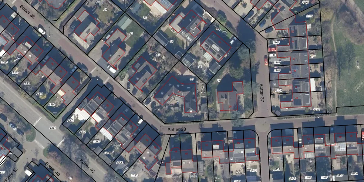 Het perceel waarop Botter 38 21 staat heeft een oppervlakte van 820 m². Dit is een groot perceel. De perceeloppervlakte wordt geregistreerd door het Kadaster. Gedetailleerde informatie over de maten van dit perceel kunt u vinden in het rapport Kadastrale kaart met maatvoering van Botter 38 21.