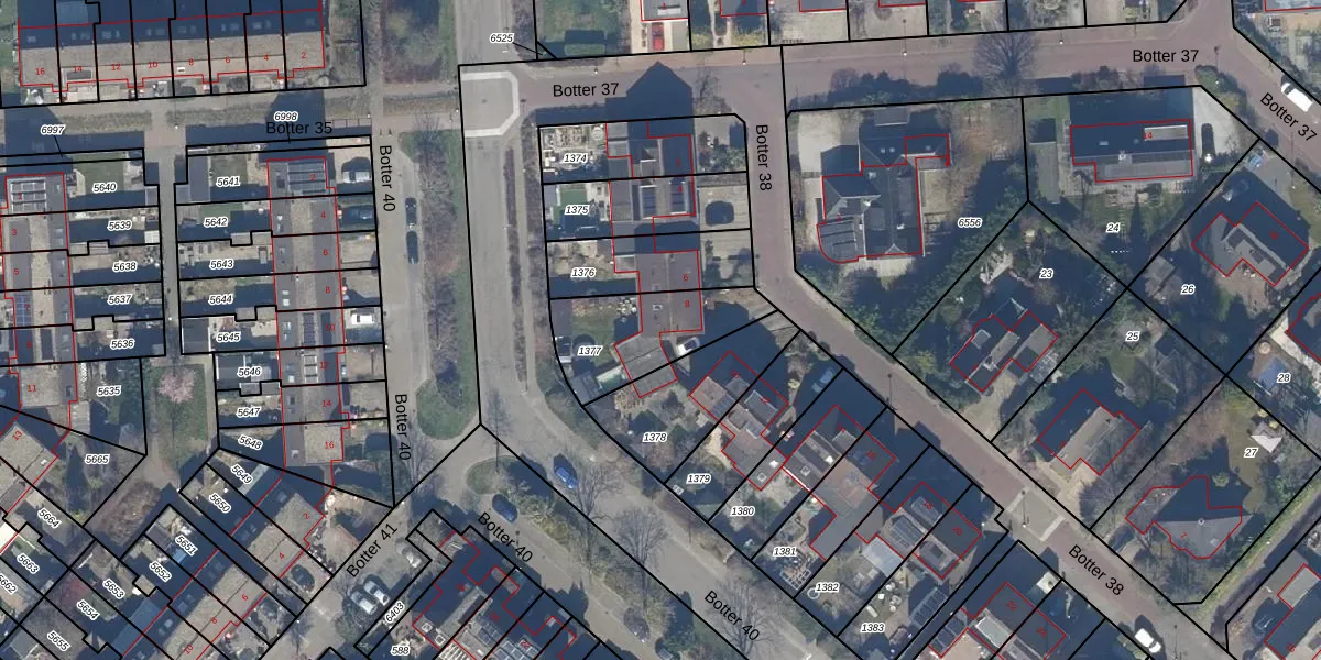 Het perceel waarop Botter 38 8 staat heeft een oppervlakte van 350 m². Dit is een groot perceel. De perceeloppervlakte wordt geregistreerd door het Kadaster. Gedetailleerde informatie over de maten van dit perceel kunt u vinden in het rapport Kadastrale kaart met maatvoering van Botter 38 8.