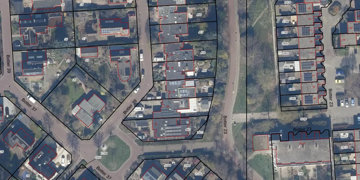 Het perceel waarop Botter 39 37 staat heeft een oppervlakte van 377 m². Dit is een groot perceel. De perceeloppervlakte wordt geregistreerd door het Kadaster. Gedetailleerde informatie over de maten van dit perceel kunt u vinden in het rapport Kadastrale kaart met maatvoering van Botter 39 37.