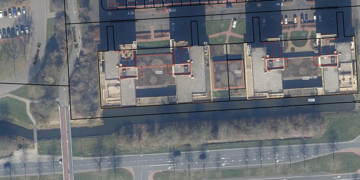 Het perceel waarop Bremenstraat 159 staat heeft een oppervlakte van 2360 m². Dit is een zeer groot perceel. De perceeloppervlakte wordt geregistreerd door het Kadaster. Gedetailleerde informatie over de maten van dit perceel kunt u vinden in het rapport Kadastrale kaart met maatvoering van Bremenstraat 159.