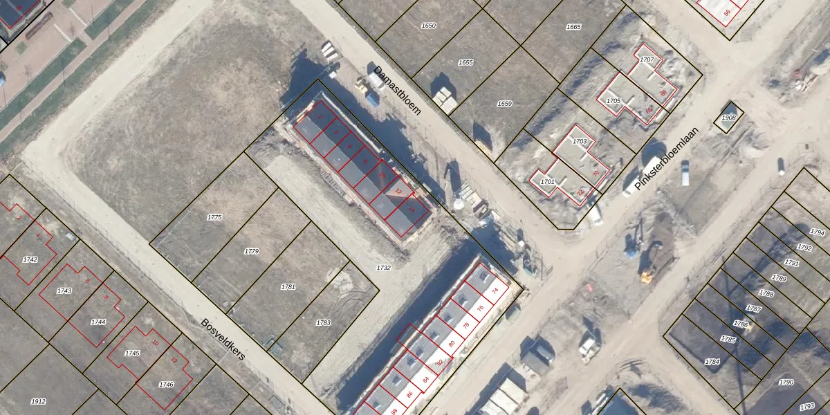 Het perceel waarop Damastbloem 14 staat heeft een oppervlakte van 2565 m². Dit is een zeer groot perceel. De perceeloppervlakte wordt geregistreerd door het Kadaster. Gedetailleerde informatie over de maten van dit perceel kunt u vinden in het rapport Kadastrale kaart met maatvoering van Damastbloem 14.