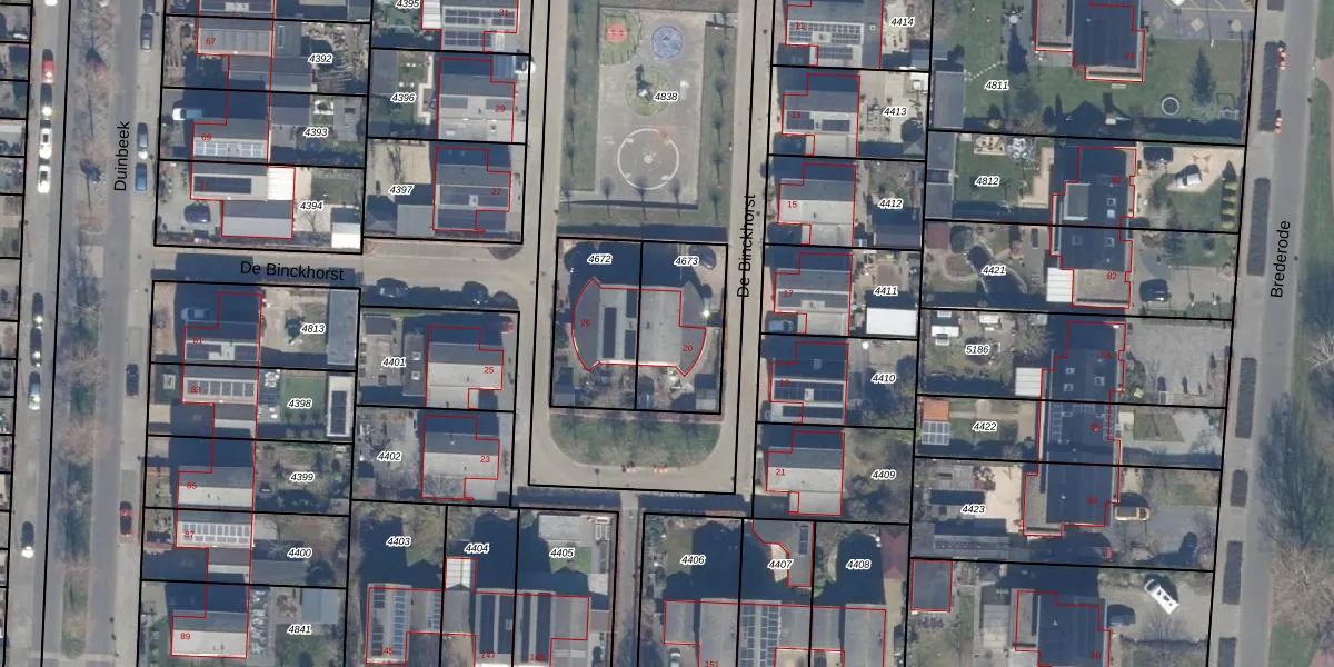 Het perceel waarop De Binckhorst 20 staat heeft een oppervlakte van 322 m². Dit is een groot perceel. De perceeloppervlakte wordt geregistreerd door het Kadaster. Gedetailleerde informatie over de maten van dit perceel kunt u vinden in het rapport Kadastrale kaart met maatvoering van De Binckhorst 20.