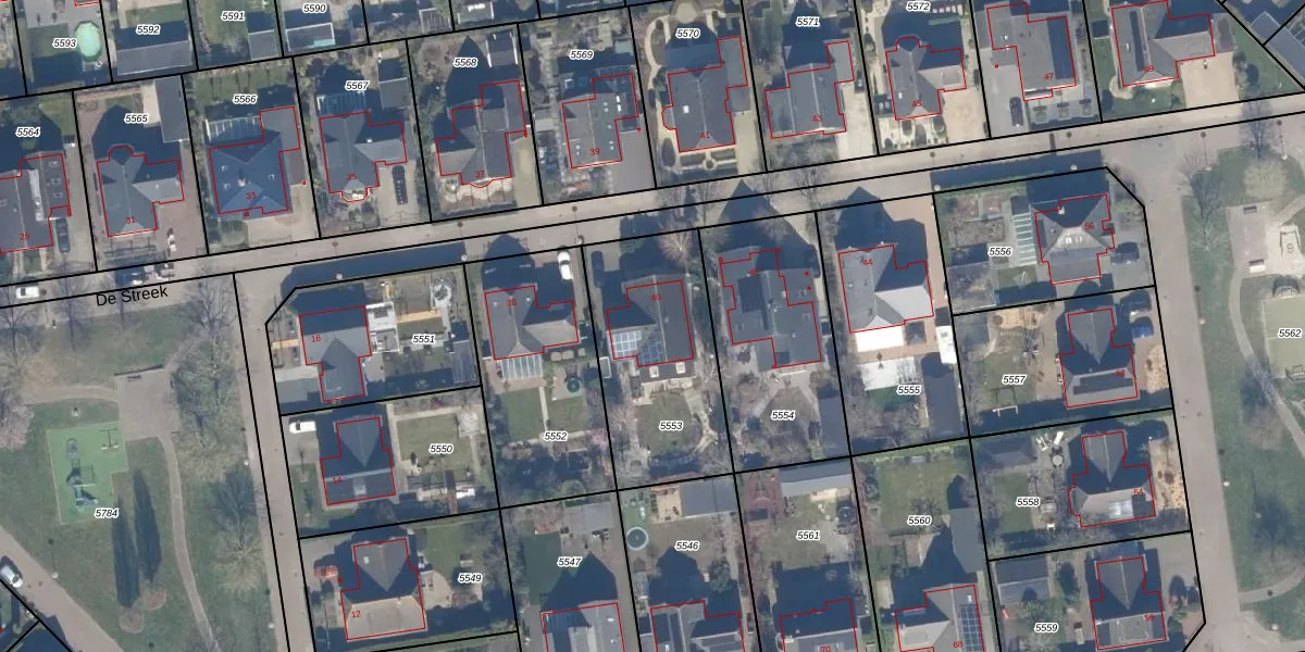 Het perceel waarop De Streek 40 staat heeft een oppervlakte van 689 m². Dit is een groot perceel. De perceeloppervlakte wordt geregistreerd door het Kadaster. Gedetailleerde informatie over de maten van dit perceel kunt u vinden in het rapport Kadastrale kaart met maatvoering van De Streek 40.