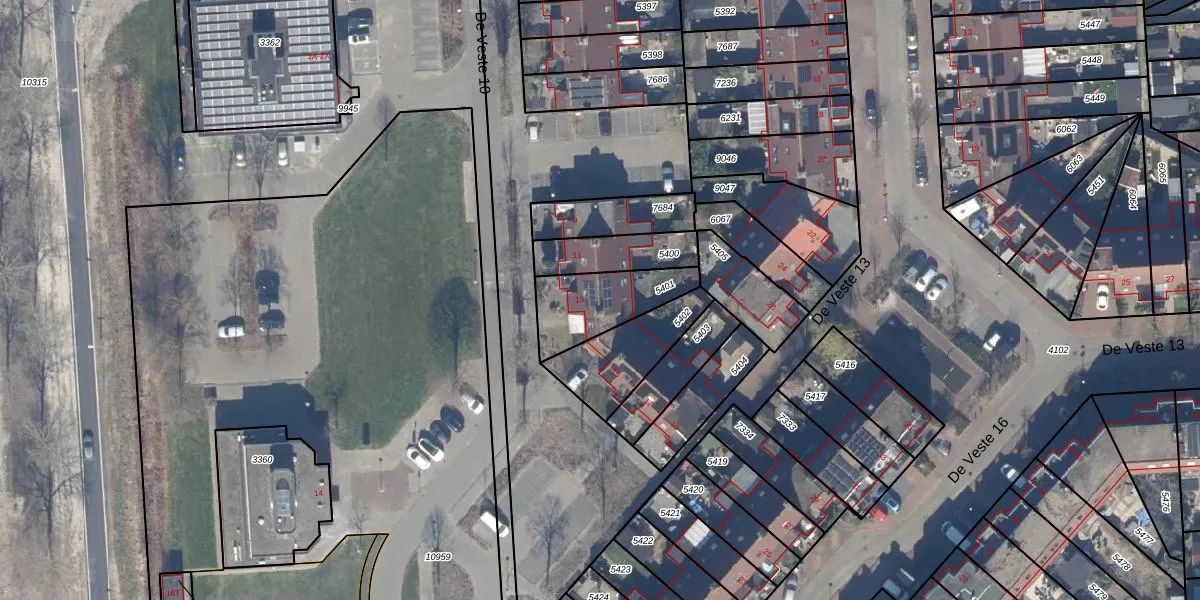 De Veste 10 13 is gelegen op kadastraal perceel LLS00M5401. Deze kadastrale aanduiding is uniek en wordt gebruikt door het Kadaster om eigendomsrechten en andere zakelijke rechten vast te leggen. Het perceel maakt onderdeel uit van de kadastrale gemeente Lelystad.