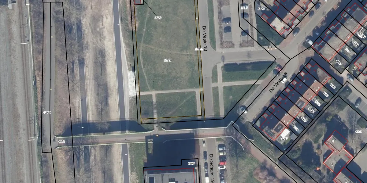 Het perceel waarop De Veste 10 56 staat heeft een oppervlakte van 2290 m². Dit is een zeer groot perceel. De perceeloppervlakte wordt geregistreerd door het Kadaster. Gedetailleerde informatie over de maten van dit perceel kunt u vinden in het rapport Kadastrale kaart met maatvoering van De Veste 10 56.