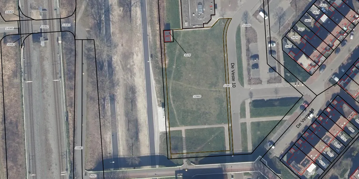 Het perceel waarop De Veste 10 66 staat heeft een oppervlakte van 2290 m². Dit is een zeer groot perceel. De perceeloppervlakte wordt geregistreerd door het Kadaster. Gedetailleerde informatie over de maten van dit perceel kunt u vinden in het rapport Kadastrale kaart met maatvoering van De Veste 10 66.