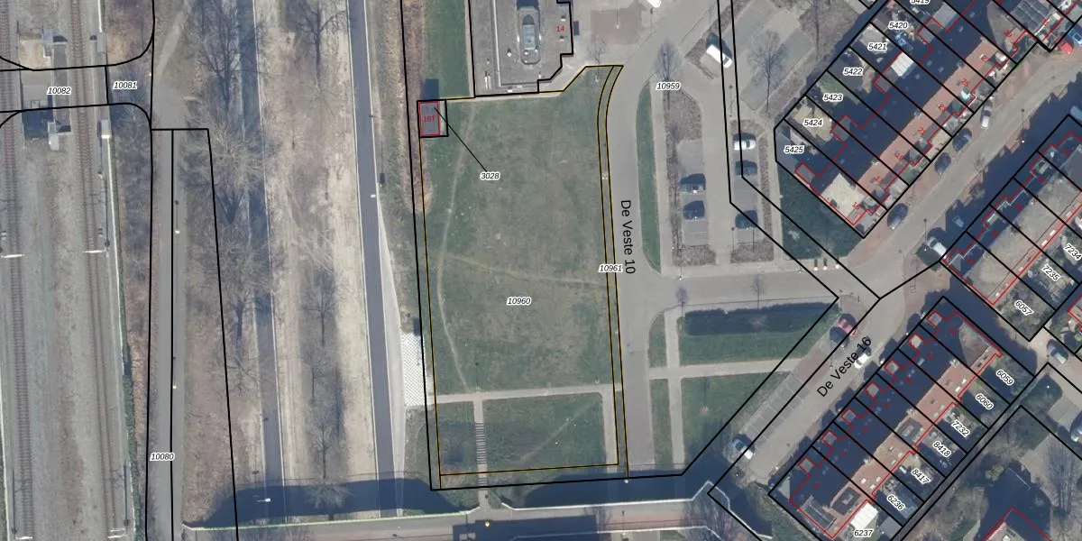 Het perceel waarop De Veste 10 76 staat heeft een oppervlakte van 2290 m². Dit is een zeer groot perceel. De perceeloppervlakte wordt geregistreerd door het Kadaster. Gedetailleerde informatie over de maten van dit perceel kunt u vinden in het rapport Kadastrale kaart met maatvoering van De Veste 10 76.