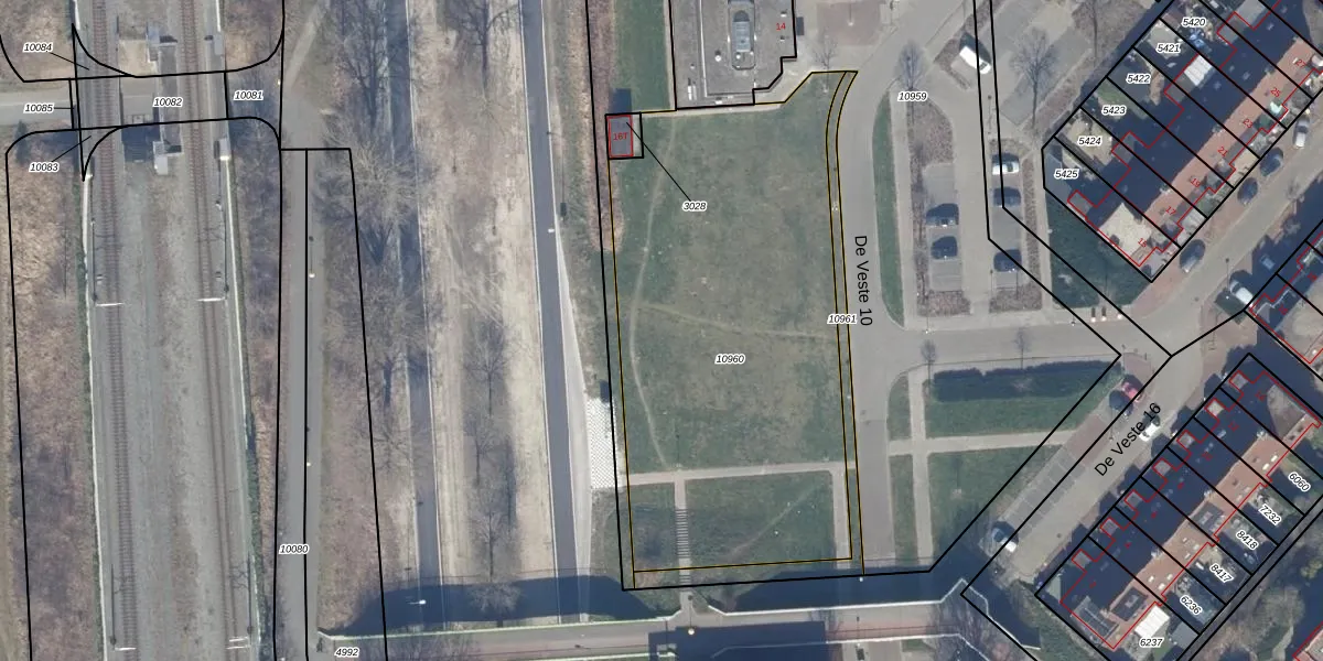 Het perceel waarop De Veste 10 90 staat heeft een oppervlakte van 2290 m². Dit is een zeer groot perceel. De perceeloppervlakte wordt geregistreerd door het Kadaster. Gedetailleerde informatie over de maten van dit perceel kunt u vinden in het rapport Kadastrale kaart met maatvoering van De Veste 10 90.