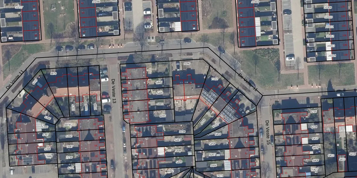 Het perceel waarop De Veste 11 14 staat heeft een oppervlakte van 802 m². Dit is een groot perceel. De perceeloppervlakte wordt geregistreerd door het Kadaster. Gedetailleerde informatie over de maten van dit perceel kunt u vinden in het rapport Kadastrale kaart met maatvoering van De Veste 11 14.